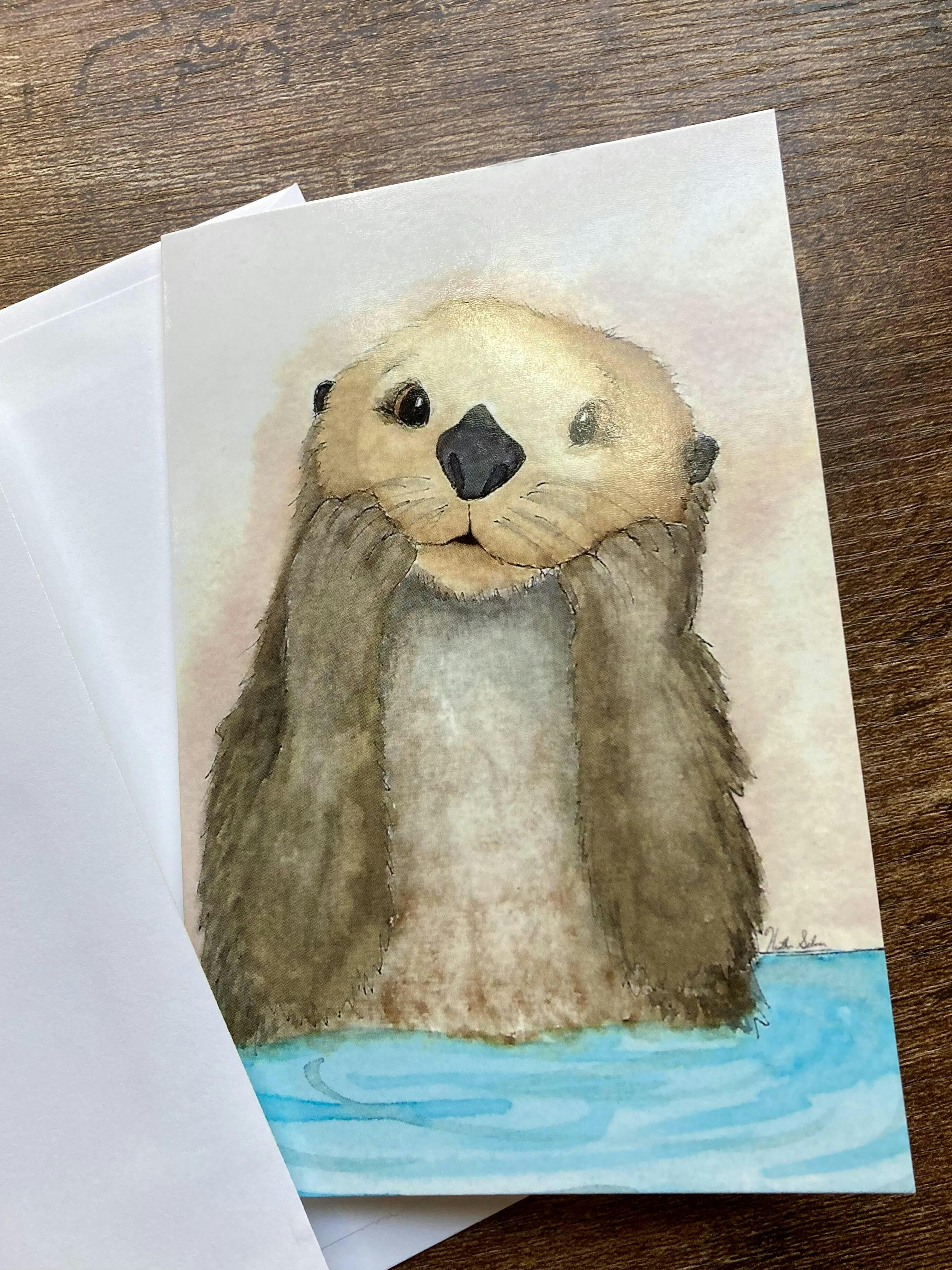 Share your sentiments in a playful sea otter greeting card! The front features a print of Heather Silver’s watercolor painting “Otter Amazement,” depicting a sea otter with paws to its face as if in surprise. Inside is blank for your message. This 4″ x 6″ card comes with a complimentary envelope.